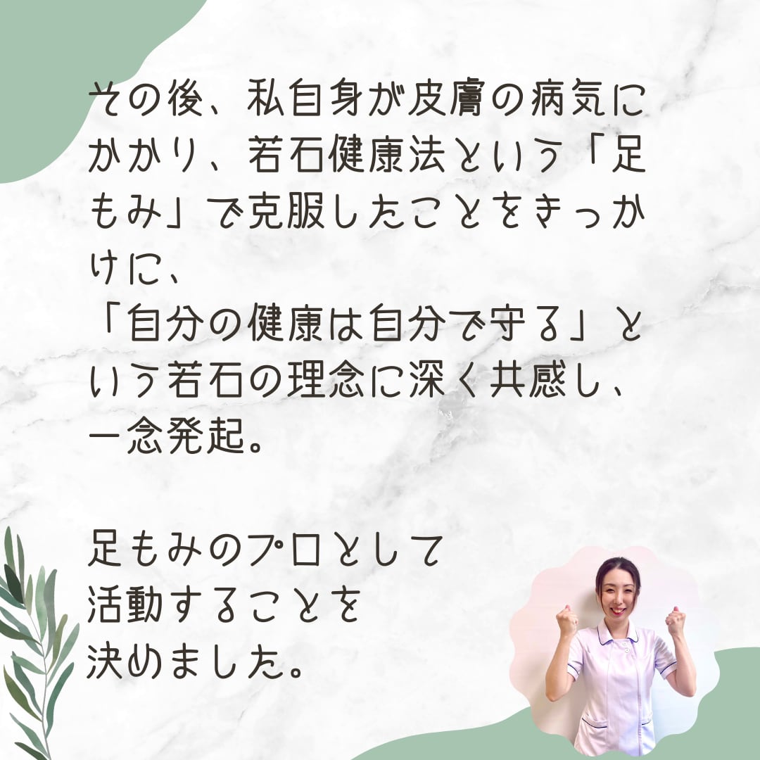抜け出せないトンネルのような不調を、若石健康法という足もみで克服したことから、同じように苦しむ人たちの助けになりたいと、2016年にプロへの道を志し、翌年には教室をオープンしました。